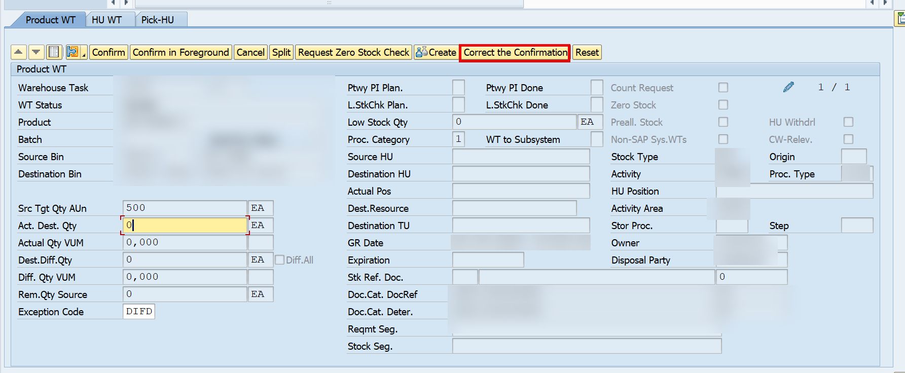 However, with certain standard configurations, it is possible to enable the reversal process within the standard system. Once the stock is stored in the final bin, it loses its inbound delivery item reference and becomes available for any warehouse process, such as picking for outbound delivery orders. However, before picking or any other warehouse activity occurs, it is possible to reverse the stock using the exception codes DIFD or COCO. The prerequisite is that the stock must retain the exact same attributes as when the putaway was performed. This process is technically known as “confirmation correction,” but from an ERP perspective, it functions the same as a standard reversal.